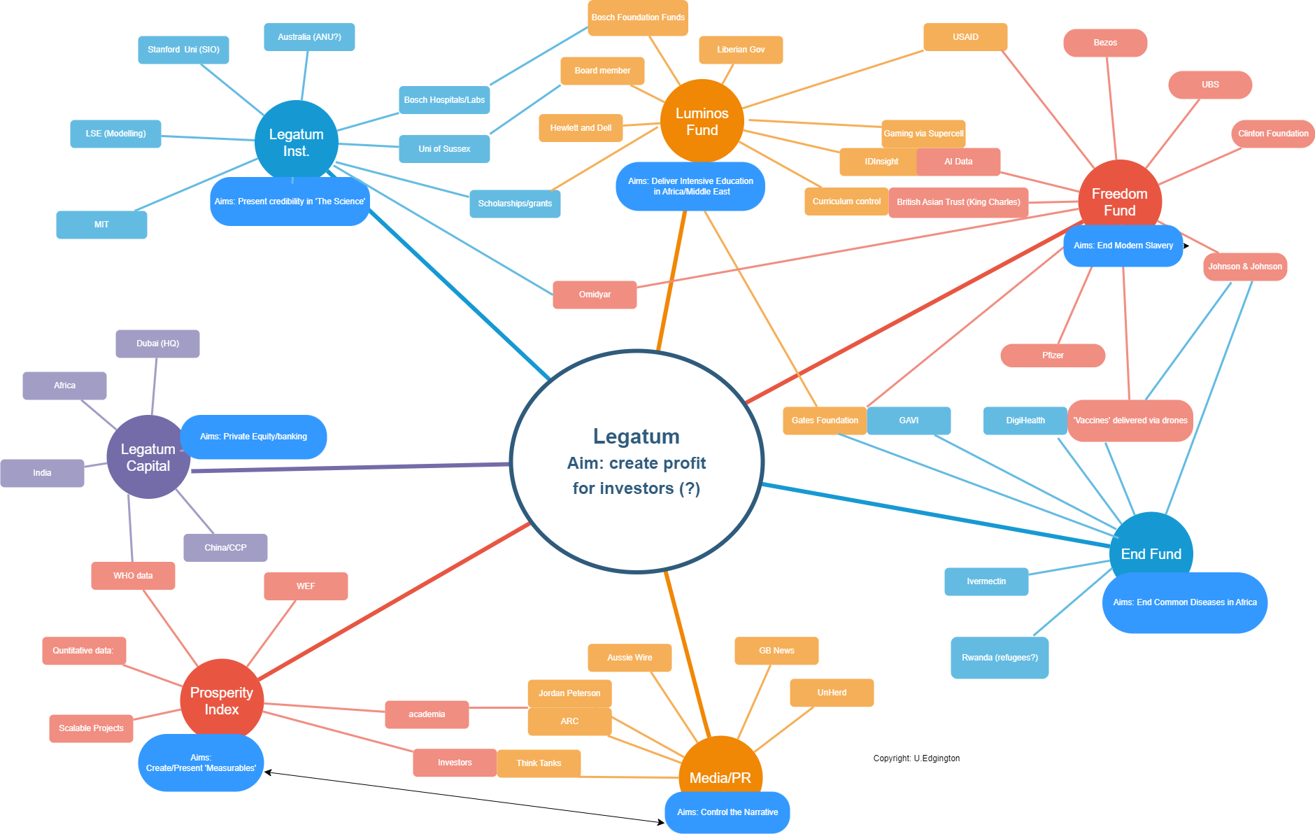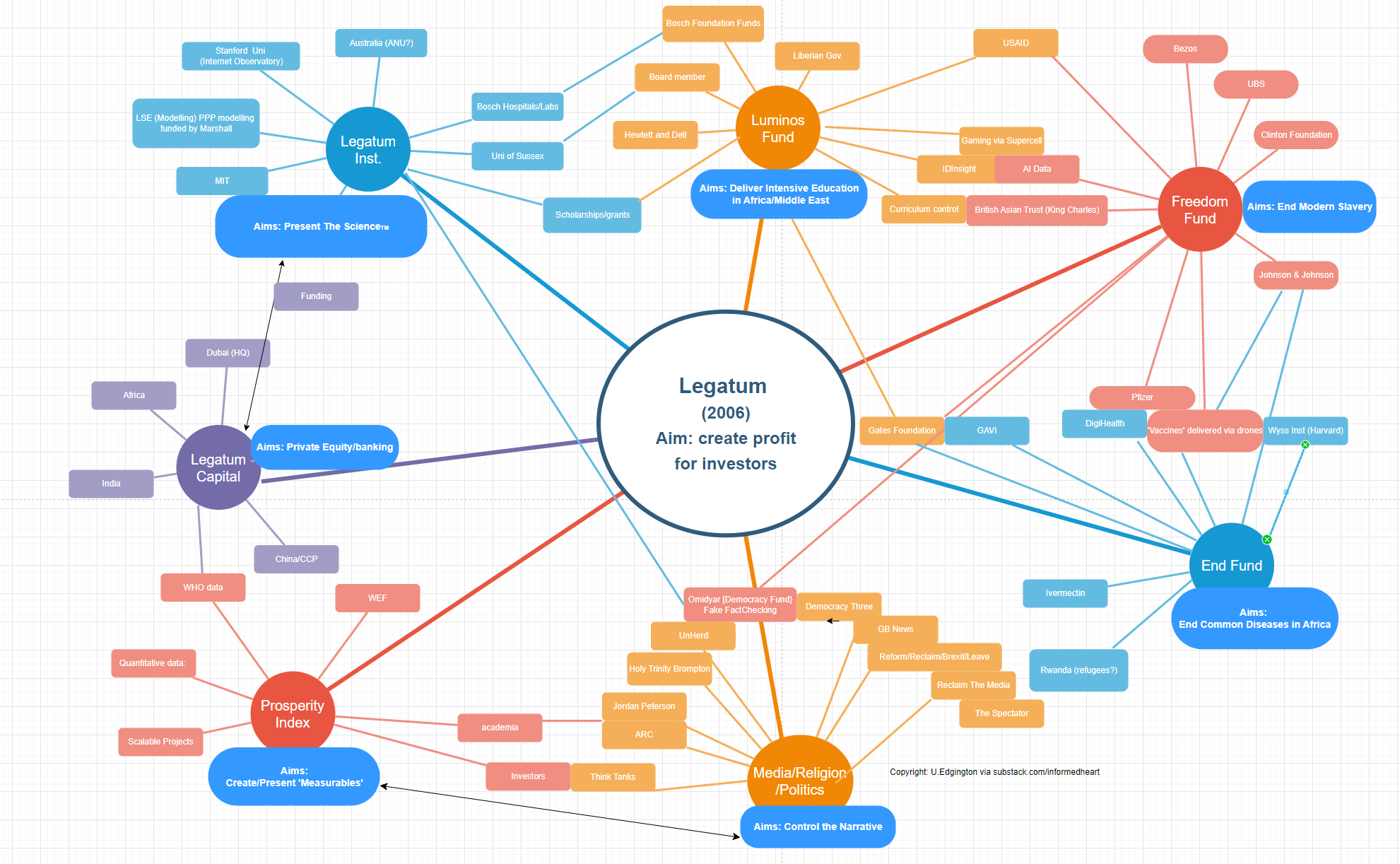 I was very pleased to be invited onto the wonderful, enthusiastic, independent journalist, Sonia Poulton’s show - which was late night here, breakfast time in the UK. Sonia with morning coffee, cocoa for me, we chatted about the significance of the 3rd ARC Conference, as it drew to a close in London this week. We discussed who some of the speakers were, how ARC is funded via impact investment banks, and what other enterprises Legatum are involved with internationally, eg Gates’exploitation of African communities. Below is the work-in-progress graphic that helps with understanding what we talked about (you’ll see ARC labelled to the left of the bottom segment ‘Media/religion/politics’):