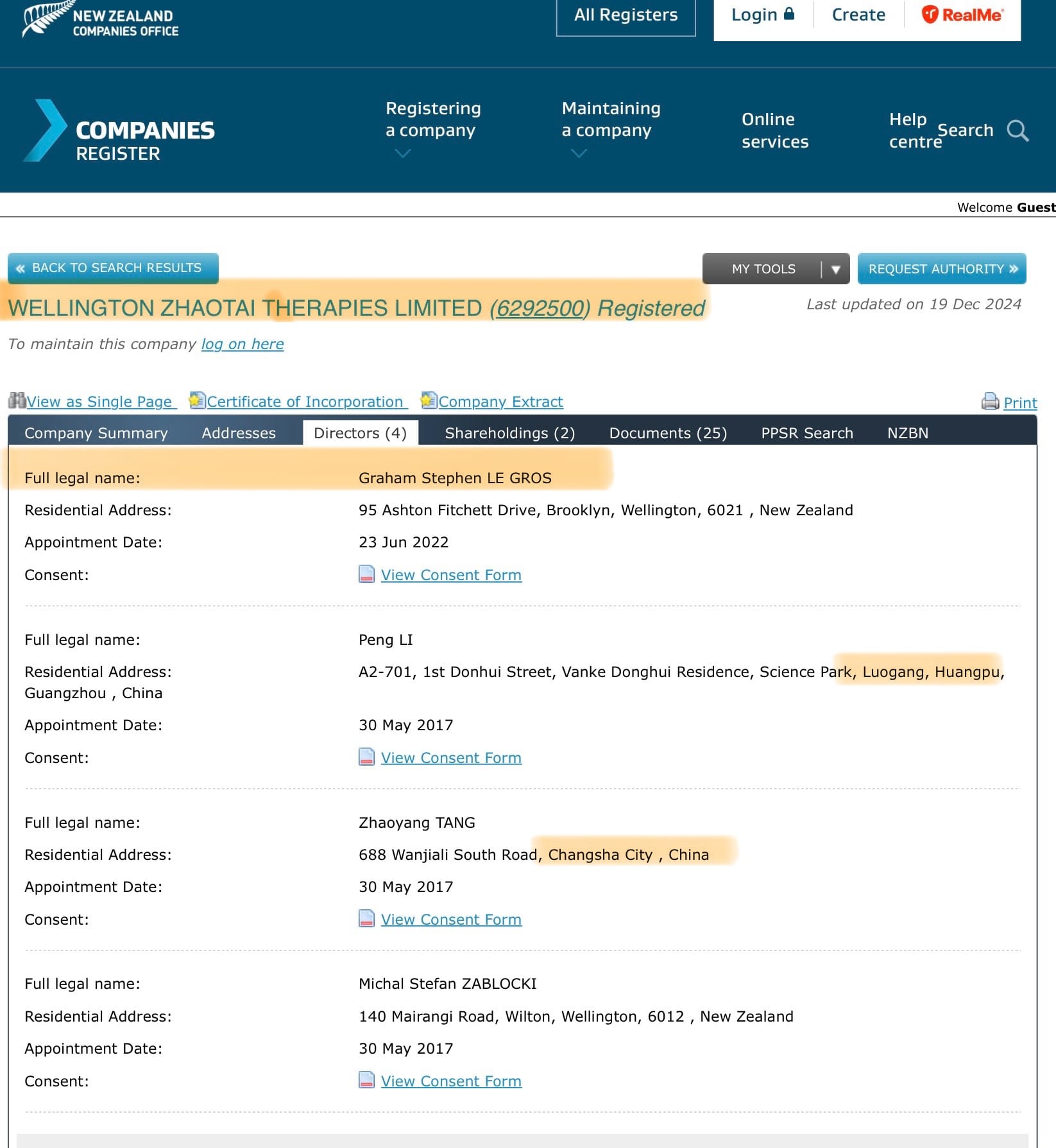Other Government funding was also provided to the Malaghan Inst, for instance in 2013 it gained NZ$6.2million. And $5million was ‘invested’ in 2019. But what of the other company Le Gros is listed as Director at? The Wellington Zhaotai Therapies Ltd was a relatively recent appointment, in June 2022: