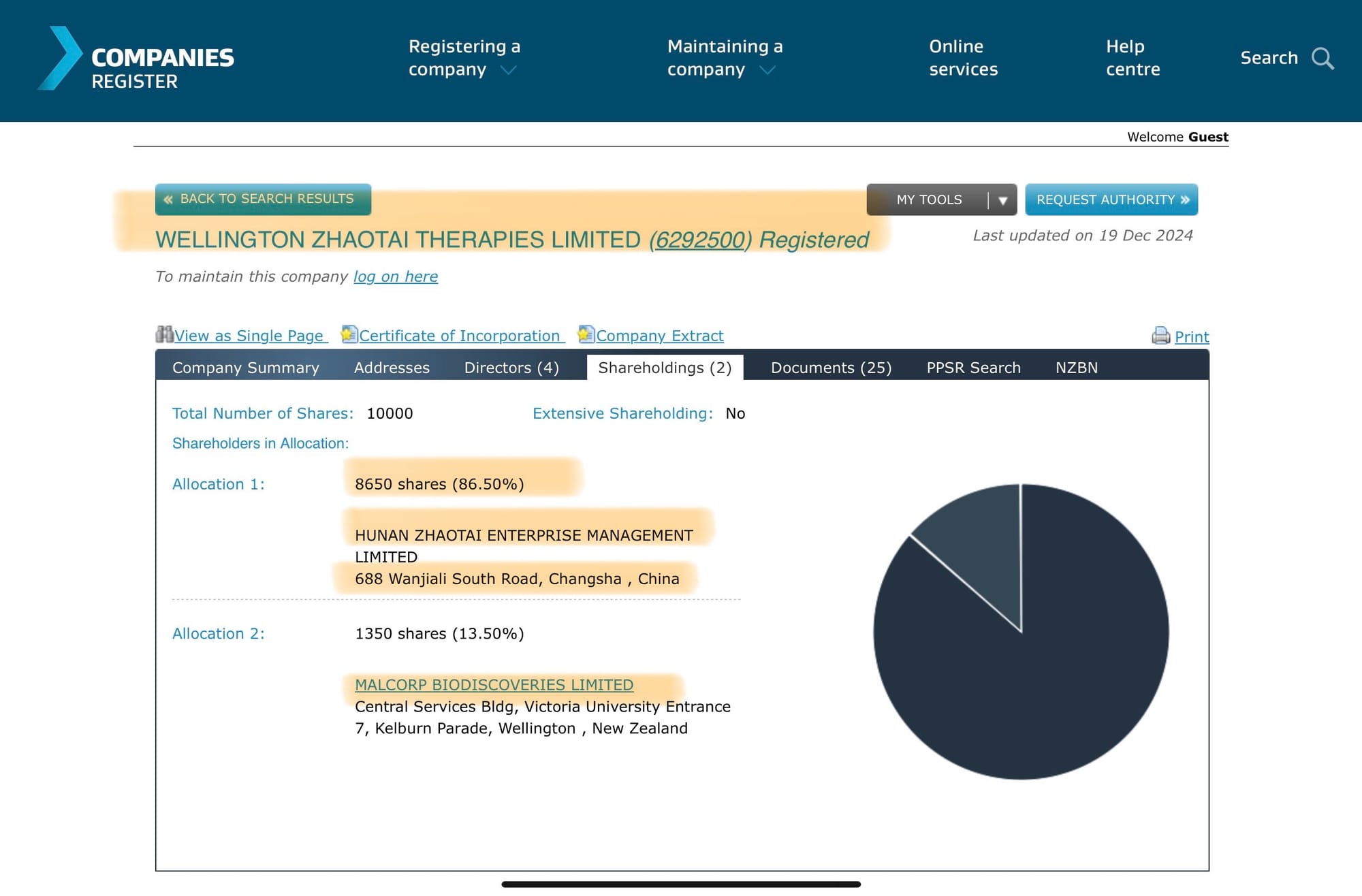 The Shareholders of Wellington Zhaotai Therapies Ltd are two entities, unsurprisingly Malcorp Biodiscoveries Ltd own 13.5%. But the remaining 85.6% is owned by Chinese biotech Hunan Zhaotai Enterprises Management Ltd which seems to trade as Hunan Zhaotai Medical Group and is based in Changsha, Hunan, China: