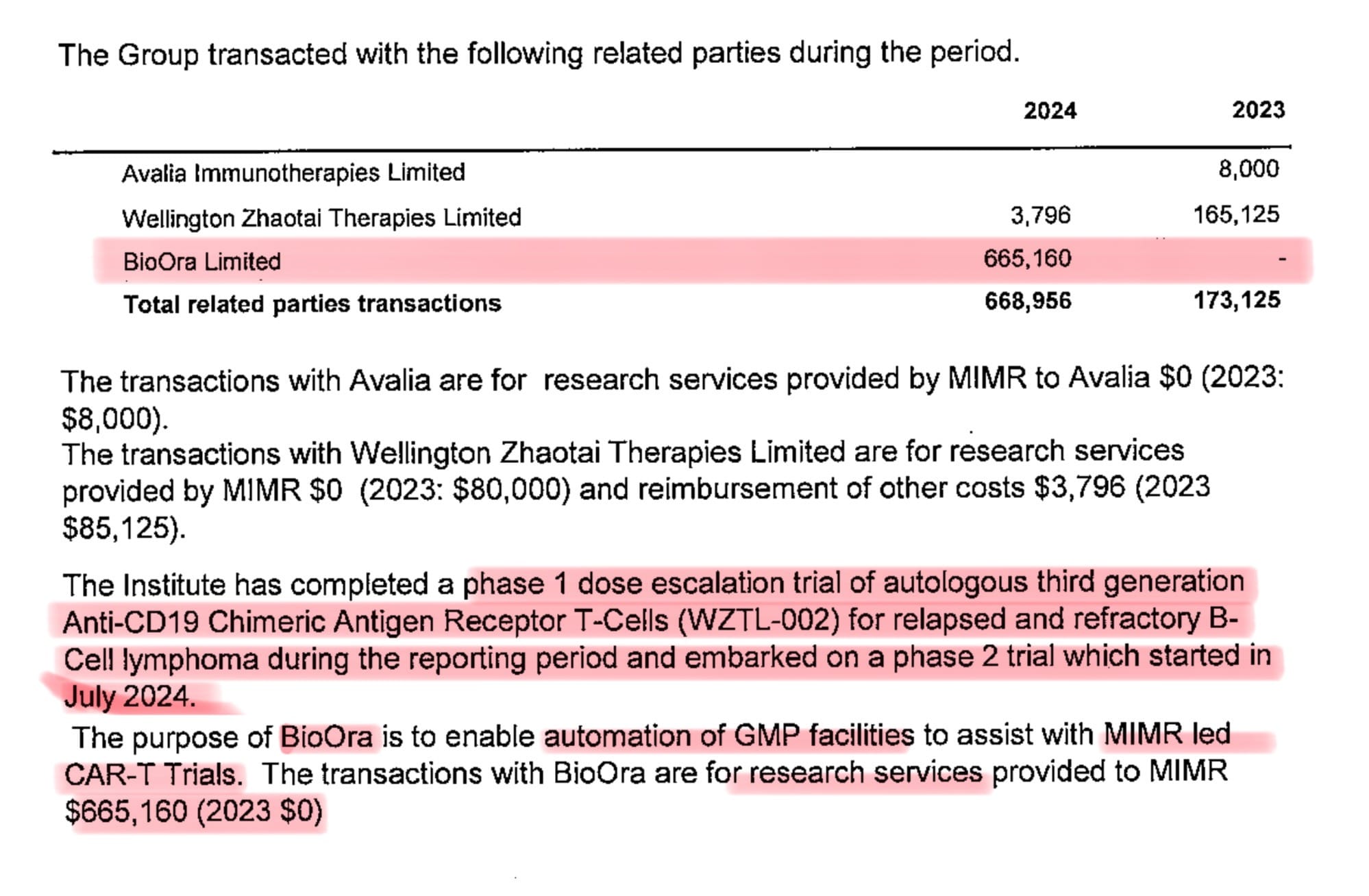 Upon closer inspection of the 2024 Charities Services Annual Report from the Malaghan Inst, I come across an interesting entry mentioning a new financial ‘loan’ ($665,160) from an intl Biotech investor, BioOra: