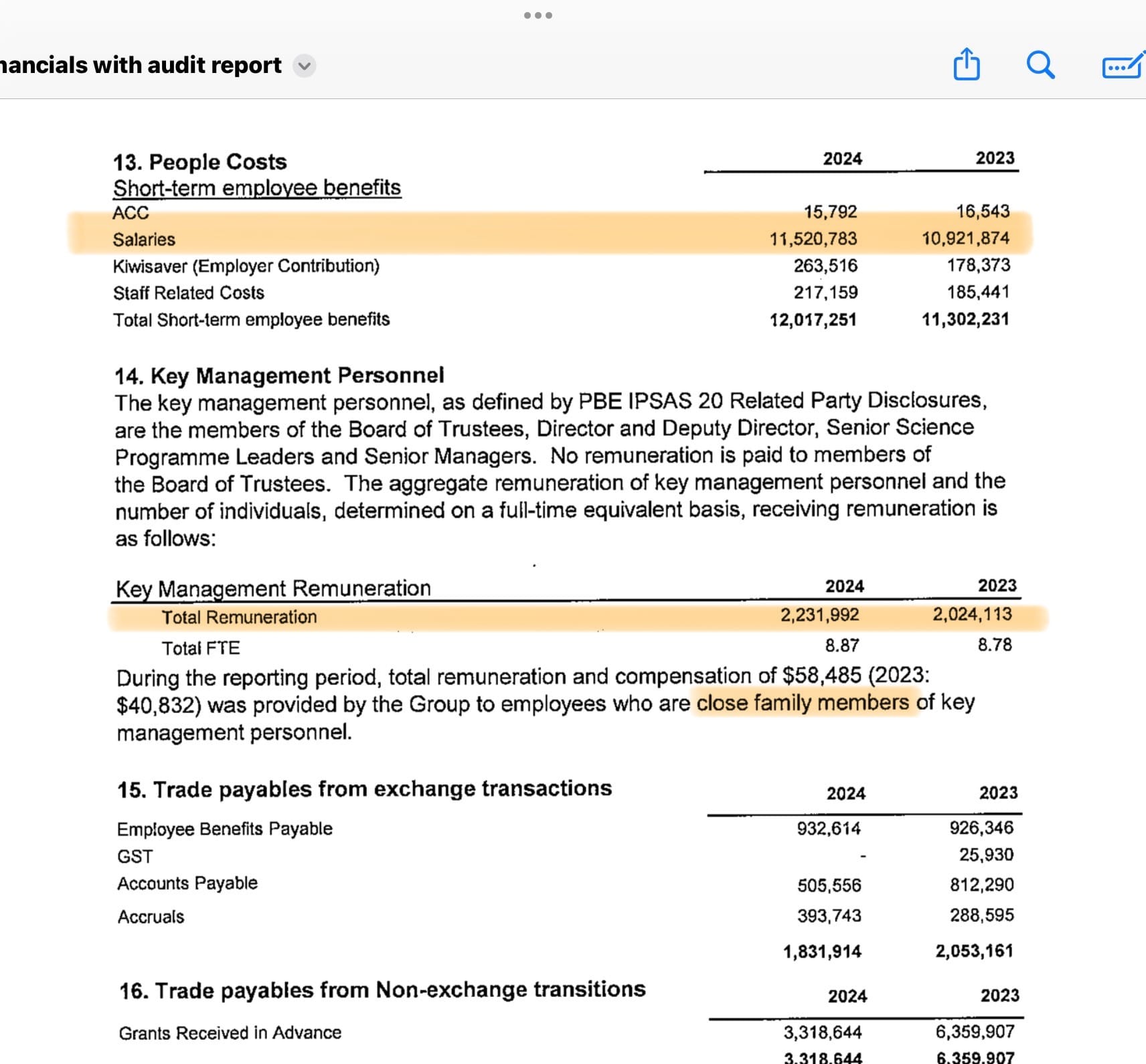 The outgoings recorded on the latest Annual Accounts, report salary expenditure of NZ$11million. It is unclear who is included in this expenditure that includes some funding for ‘close family members of key personnel’: