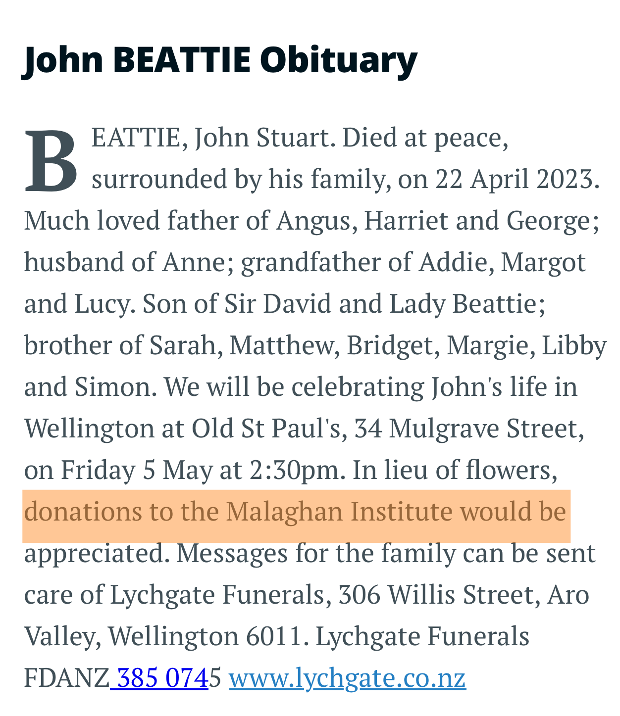 Finally, I was saddened to read in the Malaghan Inst latest Annual Report of the ‘untimely death’ in 2023 of one of their long-standing trustees, John Beattie. One has to wonder…?