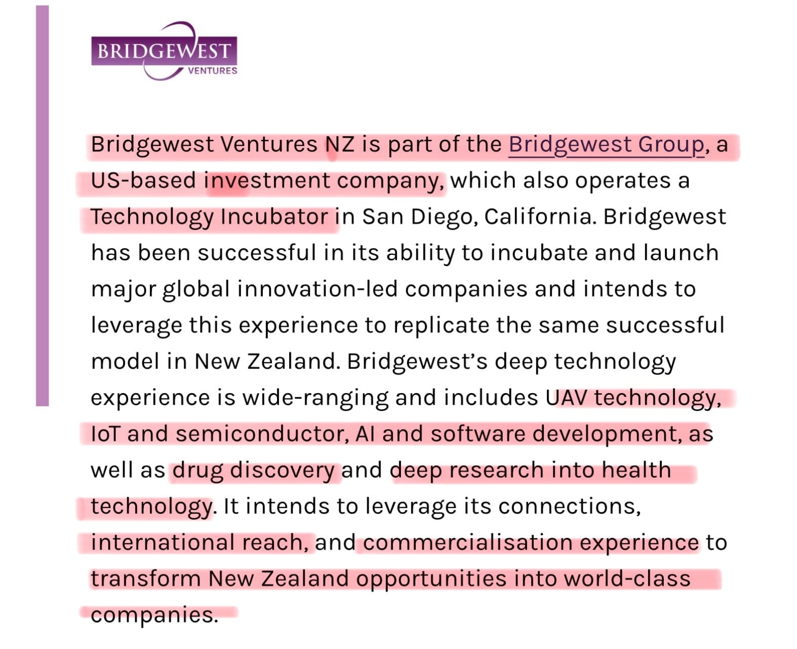 BioOra is part of the massive Bridgewest Group - international private equity investors based in the US, India and China. Its portfolio includes finance and commercial property. In fact Radio New Zealand happens to be one of their Auckland tenants, I kid you not: