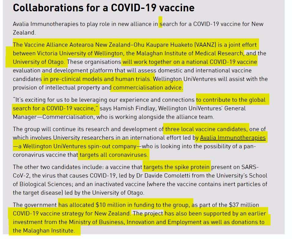 Le Gros ceased his Directorship of Avalia in Oct 2020 before it went broke. But that was AFTER the company led a partnership with Wellington, Victoria University’s Malaghan Inst and benefitted (Sept 2020) from a NZ$10m investment from taxpayers, alongside ‘donations’, as the website details here (screenshot from the WayBack Machine):
