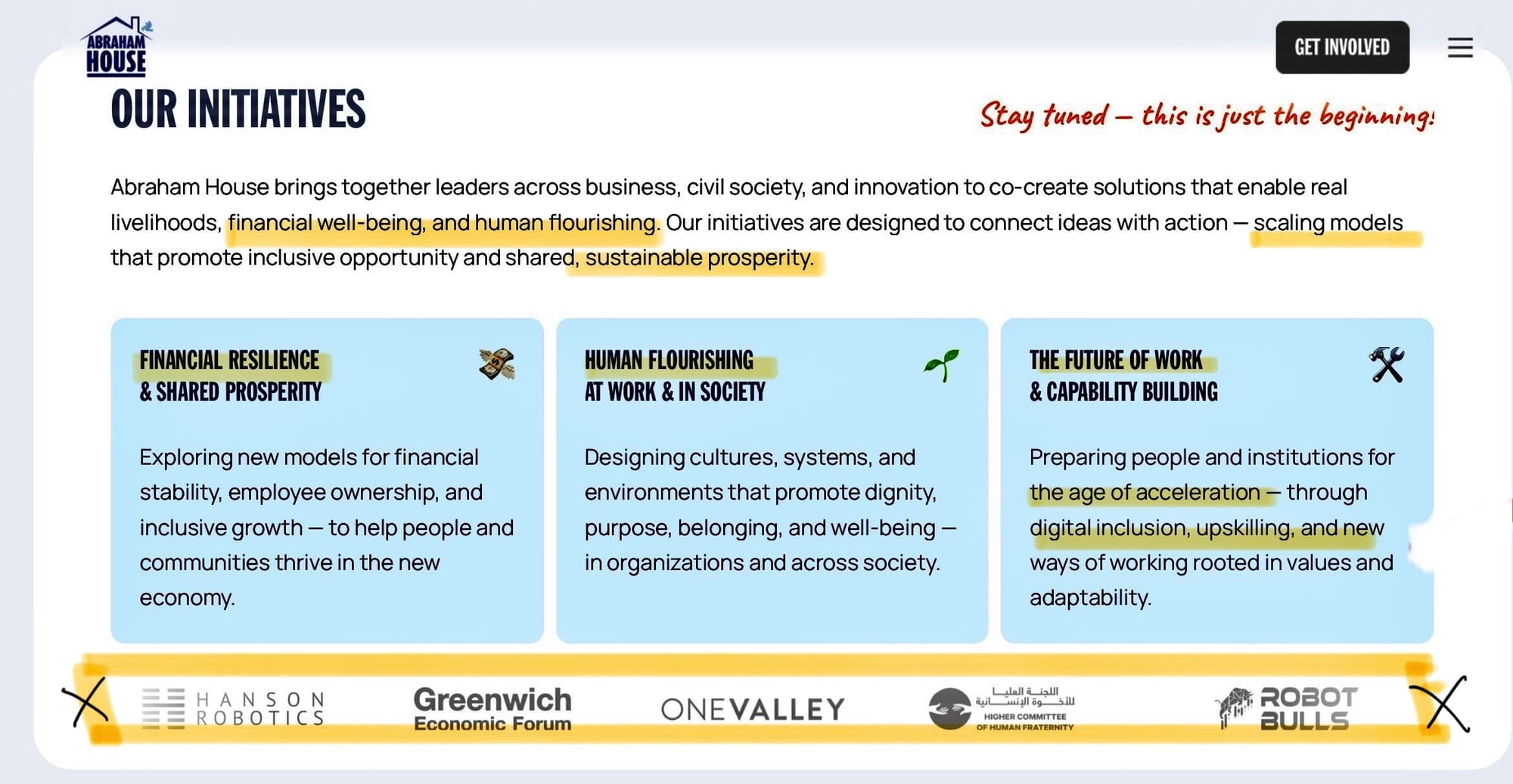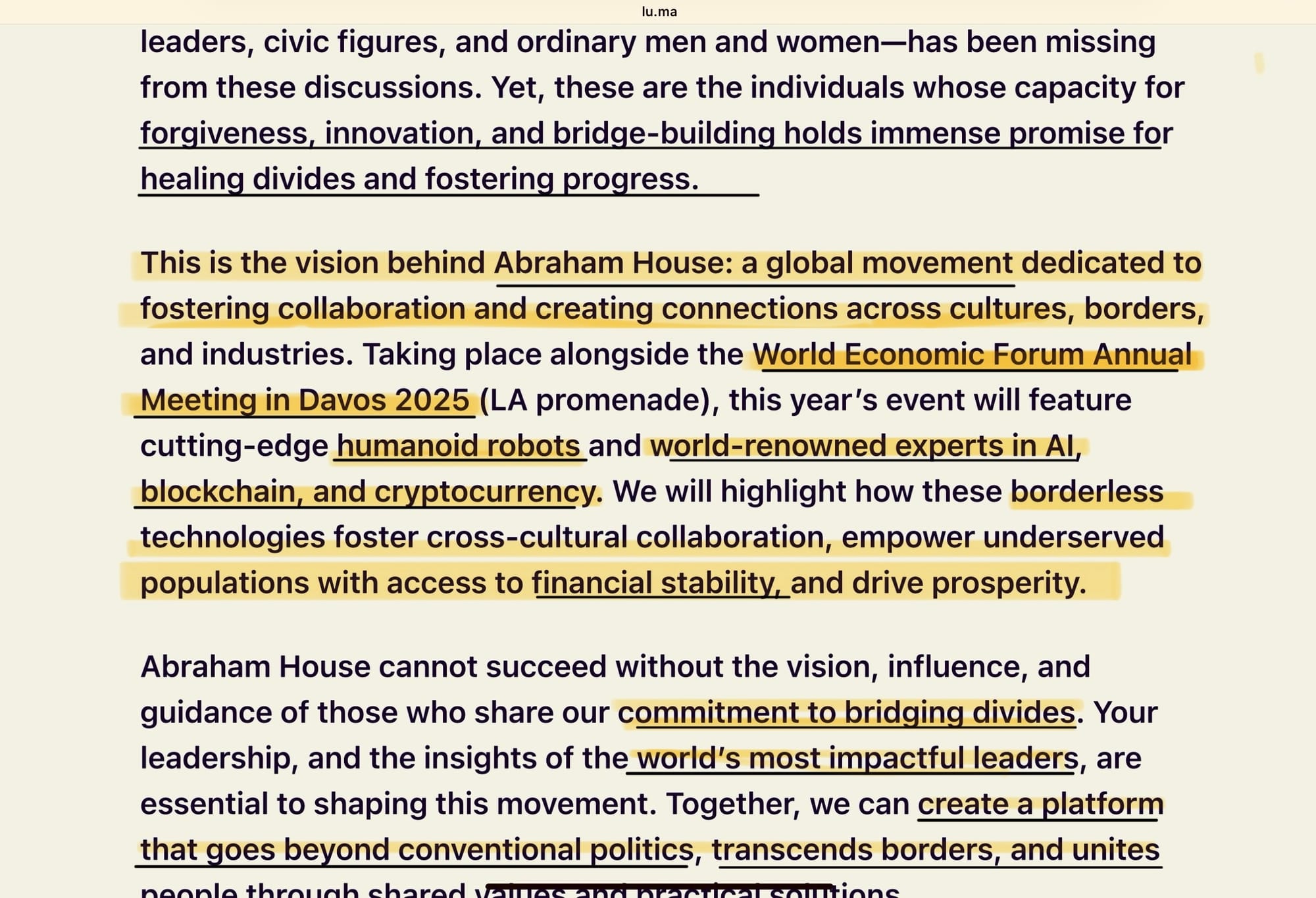 And that image, with a symbolic peace dove flying over what looks like an inviting (AI-enhanced) image of Davos in Summer would look great, eh? If we didn’t know what Davos stands for. Launched at Davos last year, we’re told Abraham House is a ‘platform’ rather than a company or charity. That it’s ‘where leaders connect and collaborate’ and aim for ‘inclusive prosperity’. Wonderful. But those words are important. It’s UN & WEF DoubleSpeak. And there’s our friend Aseem, ‘Strategic Advisor’ on the About Us page:
