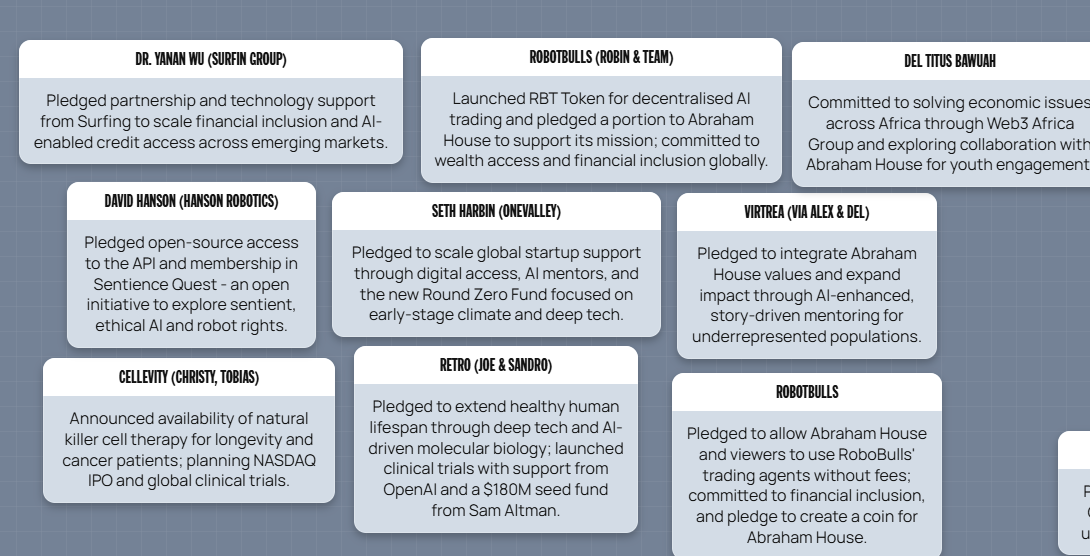 For example, we can see finance tech support from Surfin Group; Open-source membership and AI software from Hanson Robotics; access to BioTech AI-led clinical trial injectables for cancer patients from Cellevity and OpenAI monitoring from Sam Altman via Retro; market share-trading robots from RobotBulls. Crikey! Is there any genuine help for holistic, metabolic health interventions? Maybe some natural food suppliers for peace negotiations over a nourishing meal, or shared exercise initiatives out in nature? Nope. So let’s have a quick closer look at some of these. Their logos and aims are prominent on the AH website: