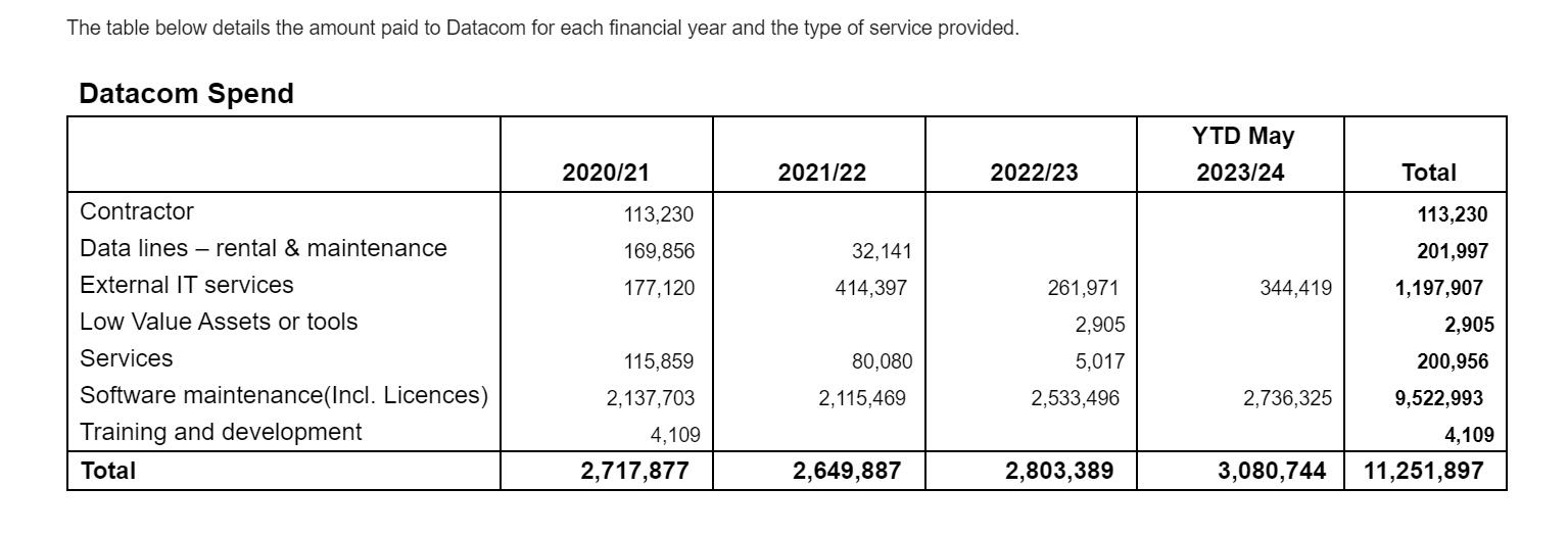 If, like me, you know how likely our NZ public servants are to be able to use an Excel spreadsheet effectively, or even be bothered check their manual calculations on a (bizarre) table like this, you won’t be surprised to see the figures above Wellington Council provided me, don’t add up. In fact, the total comes to $11,239,988. I haven’t got the time or energy to look closely at the other numbers. But whatever the nearly $12million is, I wonder whether Wellington ratepayers know what they are paying Datacom for exactly?