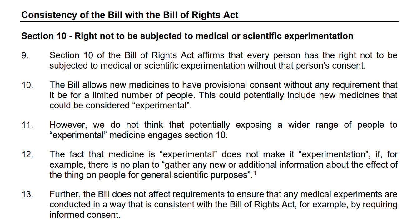 Indeed. It does. And here is that Legal Advice I referred to earlier, received by the then Attorney-General David Parker, which states, paradoxically, how the lifting of the restriction of ‘limited number of people’ from s23 in the Medicines Amendment Bill, does NOT constitute a breach of s10 of our NZ Bill of Rights Act. Because - get this - an ‘experimental’ medicine is NOT ‘experimentation’ IF there is ‘no plan to gather new or additional info on the ‘thing’ (medicine). (see below):