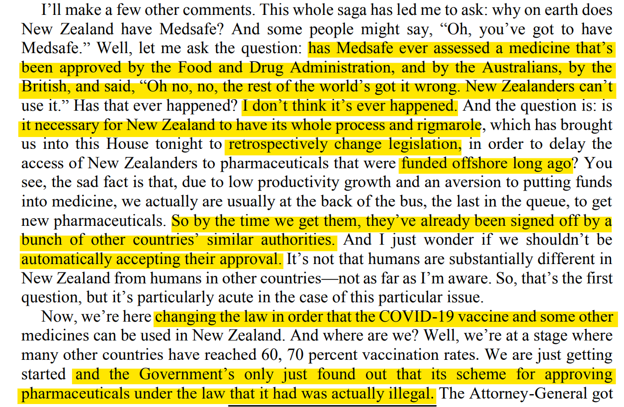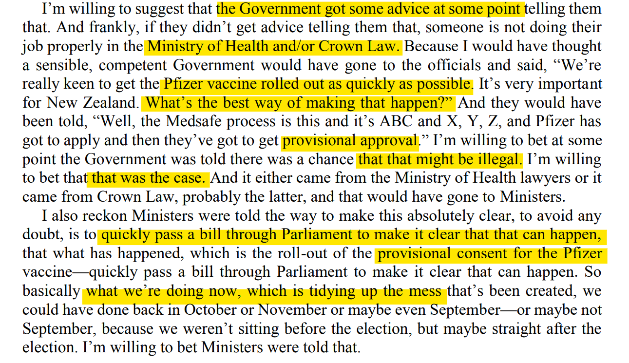 “The reason why we’re debating it, of course, is the decision of Her Honour Justice Ellis delivered yesterday in the High Court in relation to relief sought by applicants essentially trying to stop the roll-out of the COVID-19 vaccine. Members may want to refer to paragraph 75 of the judgment [conclusion], which is, I think, the key one, which is the paragraph in which Her Honour notes that it is “reasonably arguable”, her words, that provisional consent granted to the Pfizer vaccine was ultra vires the Medicines Act 1981.”