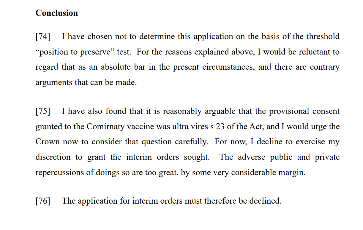 “In my view it is reasonably arguable that the decision to provisionally approve the vaccine for much wider use is problematic. If the interpretation I have articulated above is right, then s 23 does not contemplate the grant of provisional consent for a new medicine that will, before the end of the year, be made available to treat the three and a half million New Zealanders who are over the age of 16.” (my emphasis)