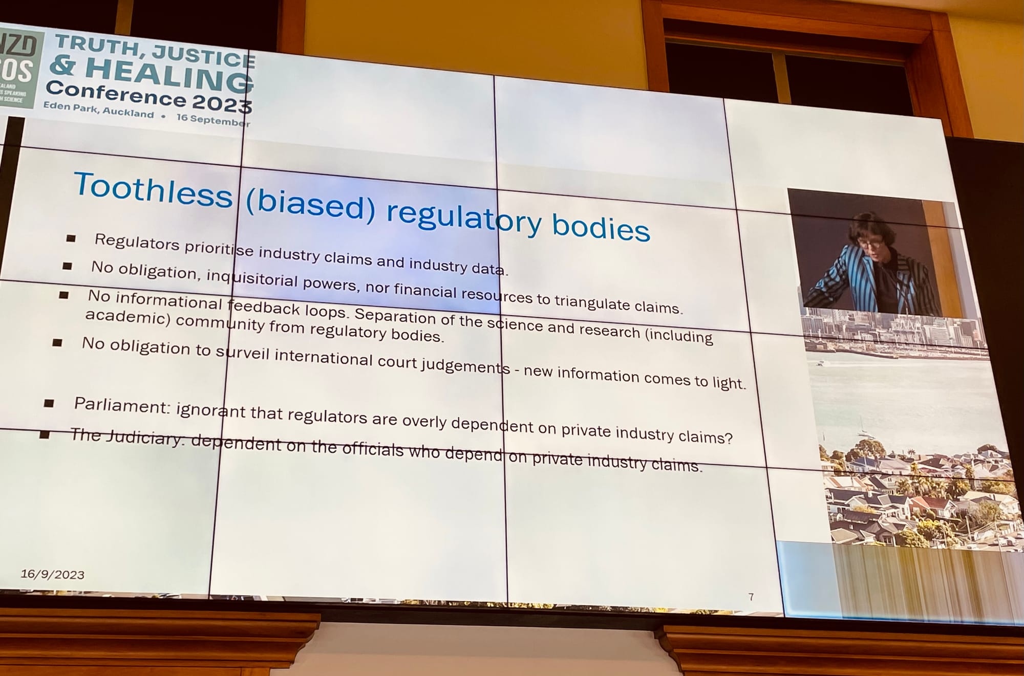 Next to speak to the audience was fellow sociologist Jodie Bruning whom I know from my environmental work for the People’s Inquiry. Jodie has written extensively in the past about the regulatory capture of the NZ Government agencies like the Environmental Protection Agency, media bias and the lack of adherence to the laws of NZ by our own Government. In this conference she artfully used these insights to present knowledge obtained from Official Information Act (OIA) responses and other sources about how the covid era shared some of the same hallmarks of corruption. In particular how the Public Interest Journalism Fund, provided to NZ media ensured the censorship of any dissenting views and the proliferation of the unethical, anti-science BigPharma propaganda. RCR was given a round of applause for the crucial independent voice they have now provided as a result of this Big Brother dystopia.