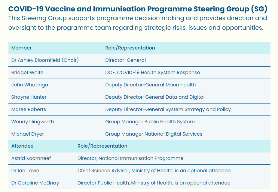 The daily ‘briefings’ from (now, Sir) Ashley Bloomfield, then-Director General for Health, were apparently founded upon the outcomes from those regular meetings. They were often chaired by Sir Ashley himself, and members attending were senior in the various NZ Gov Covid ‘response’: Covid-19 Vaccine and Immunisation Programme ‘National Director’ Ms Jo Gibbs, (Dr) Caroline McElney, Dr Ian Town, Wendy Illingworth, Astrid Koorneef and many others from within Gov and externals.