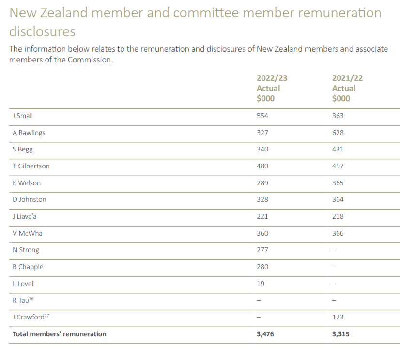 Would you be surprised to learn that Dr John Small earns >NZ$500k p/a? Yes, more than the fine imposed to Mitre10, which probably cost us taxpayers $thousands in legal fees. And that the total remuneration of this particular Quango’s ‘Commissioners’ runs to almost $3.5mill? Here’s the latest from their Annual Report: