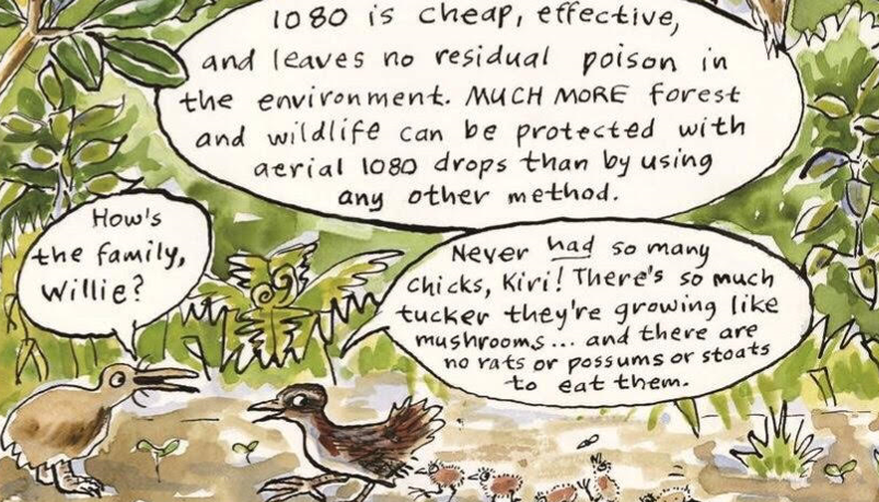 Or in contrast the (fake) images of kiwi’s eggs being eaten by possums/rats. Colourful brochures and expensive marketing videos and other PR are repeatedly rolled-out to reinforce the idea that the forests are ‘under attack’ and that the only way to ‘save our native birds’ is by spreading this highly-toxic poison over the thousands of hectares.