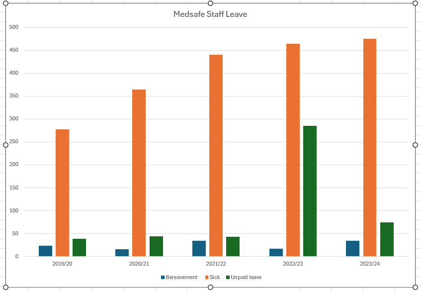 Now let’s turn to the point of this short post today, which is to summarise the Official Information Act Response [Ref H2024046370] which shows a shocking increase in absence from work amongst the Medsafe staff since the covid era. I’ve created this simple graphic: