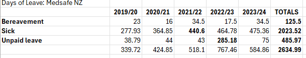 And on this rather tragic note, we can see how bereavement leave increased by 50% between the years of 2019-20 to 2021/22. And despite a decrease in 2022/3, is up again this past year. Overall, things are not looking healthy at New Zealand’s healthcare regulator enabler. Here is the raw data incase readers can see any of my mistakes or amendments needed: