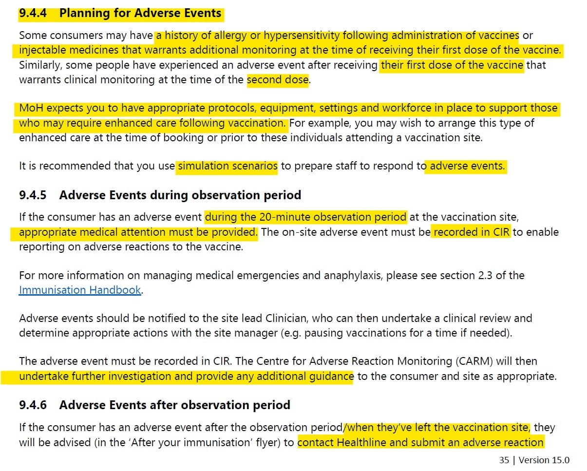 Extract above from a MoH document provided via an OIA on informed consent, citation unknown (I’ve asked). I thought it was part of the NZ “Immunisation Handbook’ but not so. [UPDATE 24/04/24 This extract is confirmed as part of these Guidelines, changes/versions noted].