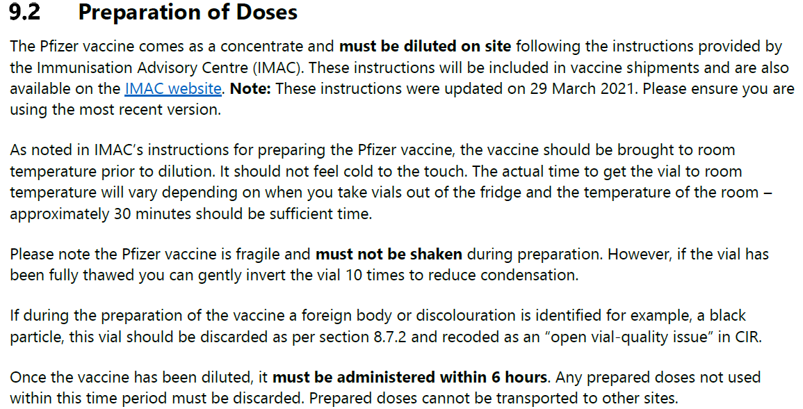 It’s worth noting that the MoH ‘owned’ the supply chain when the vials reach the distributor. In the hot Kiwi sunshine, I’m unsure how the obscure ‘frozen’ requirements for the vials were maintained? And at the Centres themselves, the Operating Guidelines provide some (horrifying) insight into the vaccinator’s training about how to dilute the (6 or 7) injection doses from each vial: