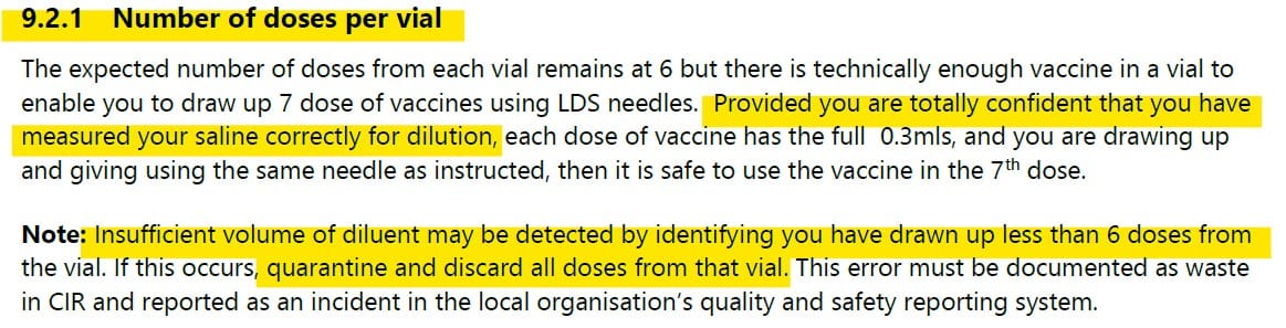 These extracts beg questions like - what is the definition of ‘room temperature’, when there was so much variability between locations, times and facilities? And how does a ‘vaccinator’ (some of whom only had a few hours training) who is ‘totally confident’ about measuring the saline for dilution, get confirmation of competency? I wonder what kind of details of this ‘confidence’ were recorded in the CIR ‘incidents’?