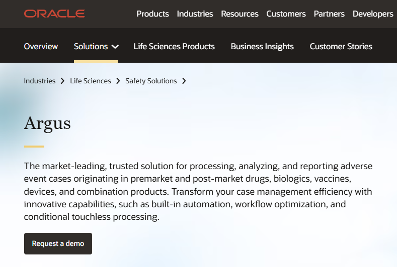 You can depend on Oracle Argus…proven compliance with drug, vaccine, and device regulations in all regions of the world, including E2B(R3), E2B(R2), eVAERS, eMDR, and IDMP. Argus’ market leadership and its ever-growing customer base gives sponsors, manufacturers confidence that it’s the right choice for companies of any size in any country.