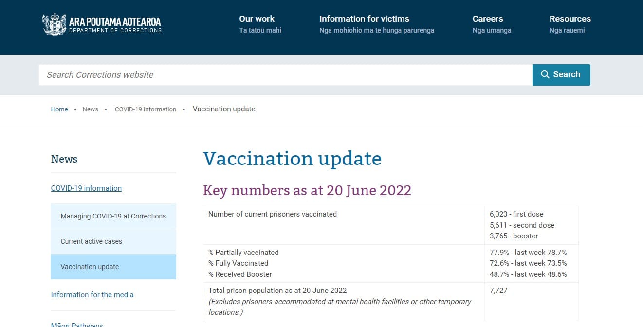 So what happened to the other 10,000 staff including the 2000 volunteers like me, who were mandated? Can we really believe that no-one stood up for bodily sovereignty? These people, even when knowing many of their prisoners who were their patients, students or even congregation at the daily prison mass, were NOT ‘vaccinated’, they just went along with the policy anyway? Why? The website where the Dept of Corrections published prisoners’ ‘vaccination’ rates has long since been deleted. But fortunately, the Wayback Machine provides us with some interesting data that confirms 72% of prisoners were ‘fully vaccinated’ and less than 49% were boosted (screenshots):
