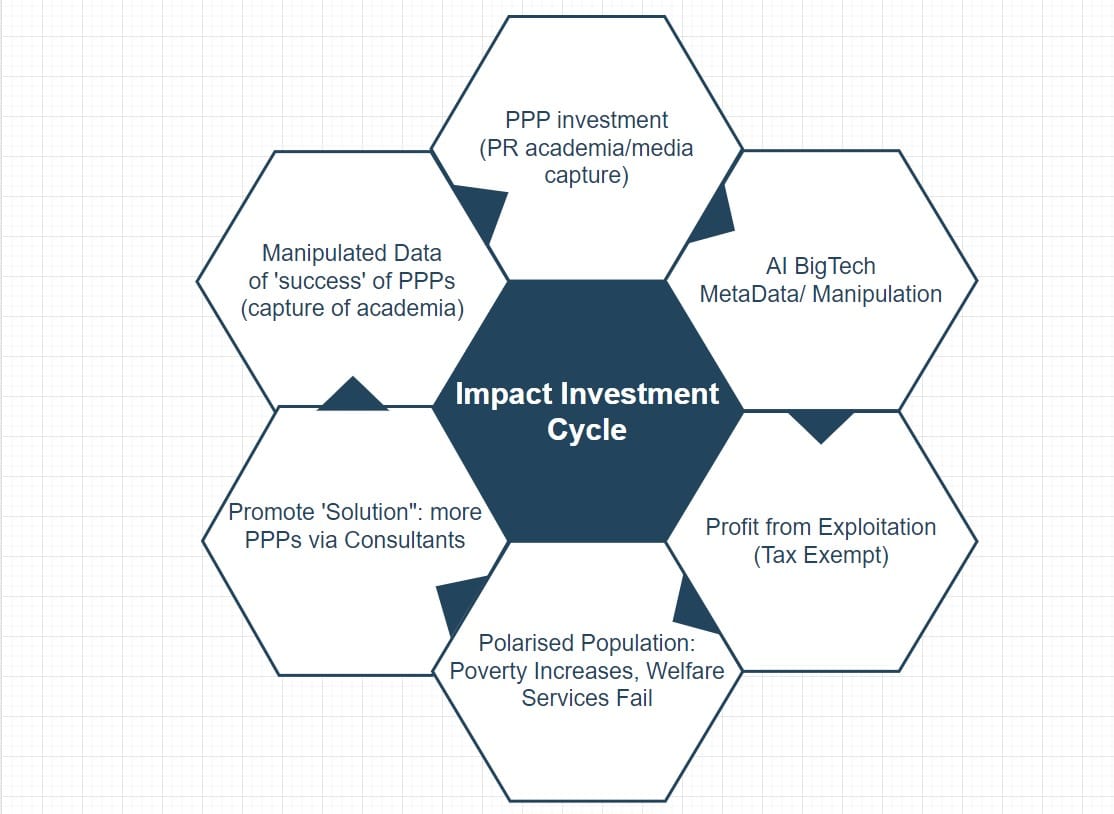 This begins to make sense now. Lightfoot appears to have no career experience or quals related to the prison service, education, health, or even military or police. But he does have experience from the UK PPPs consultancy investment sector. Was he head-hunted from the UK specifically for this role (will he inevitably become a fall guy?) And remember the PPP model has been rolling-out globally, as a copy and paste. BTW It’s perhaps not a coincidence that Mr Lightfoot’s listed qualification is from the University of Sussex - one of the UK captured many institutions that is explicitly linked to impact investment / PPP arms of the Legatum Institute, the ‘education’-focused Luminos Fund, including its Board of Directors. To recap on that, see this previous post. And here’s my draft diagram to show what is meant by impact investment: