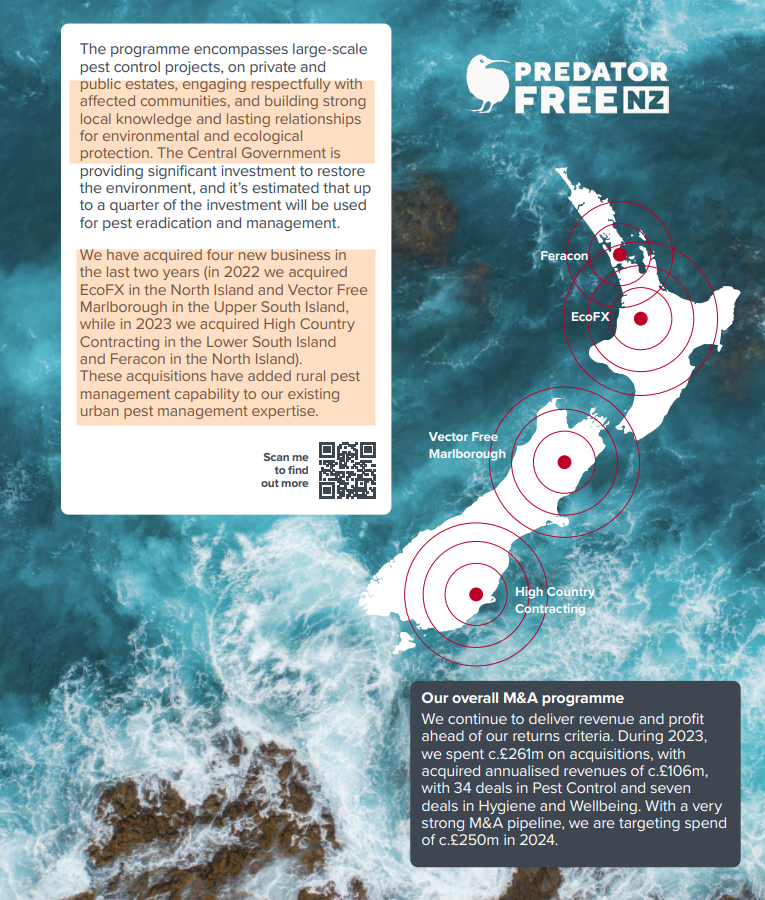 In this latest Annual Report, Rentokil Initial boast about the ‘respectful engagement with communities’ (communities that they are about to poison?) by ‘building strong local knowledge’ and ‘lasting relationships’. (maybe with NDAs?) The report goes on to list the four NZ contractors swallowed-up by BigChem Rentokil:
