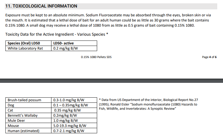 Here’s an extract from the toxicity section of the MSDS for the 1080 poisoned-food cereal baits, confirming the unknown risks: