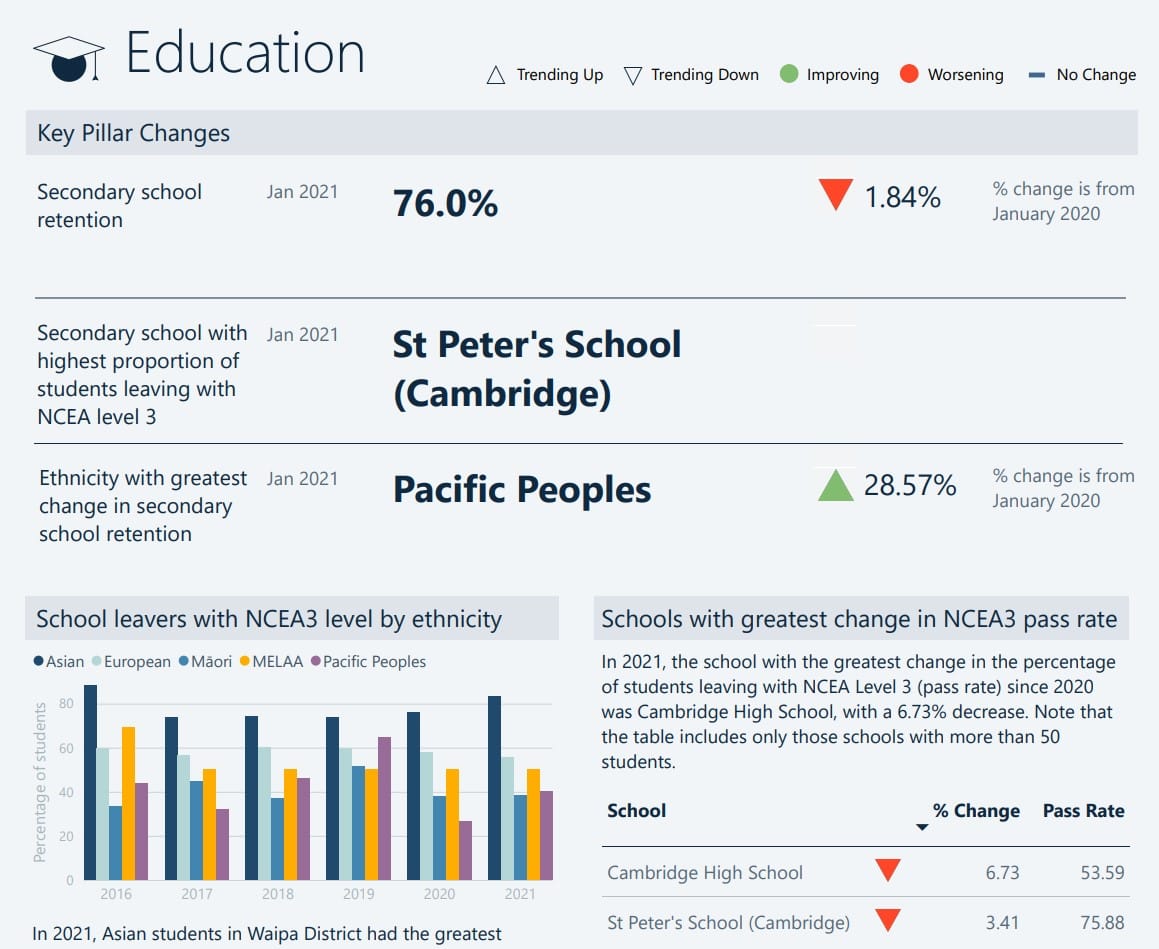 To bring us up-to-date, I checked the Waikato Wellbeing Project SDGs latest progress report from March 2023. Things are unsurprisingly not looking very rosy. Crime rates are up, health expectations are down and education, in terms of retention rates and exam passes are poor and worsening (example from one region below):