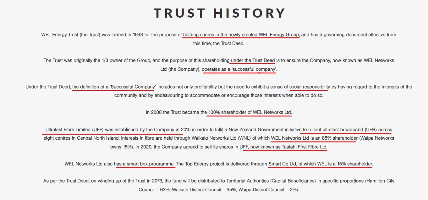 Interesting. Now I’m already familiar with the circular nature of the funding of (pseudo) charities in New Zealand. If you’re interested in that subject, I’d suggest you start with this excellent article about a specific NZ ‘charity’ by Dr Michael Gousmett here. So I was interested in looking at WEL Networks Ltd, which is an electricity company and has an PPP of ‘sustainable development’ as a charity in this project. This context is explained on the WEL Network Trusts website: