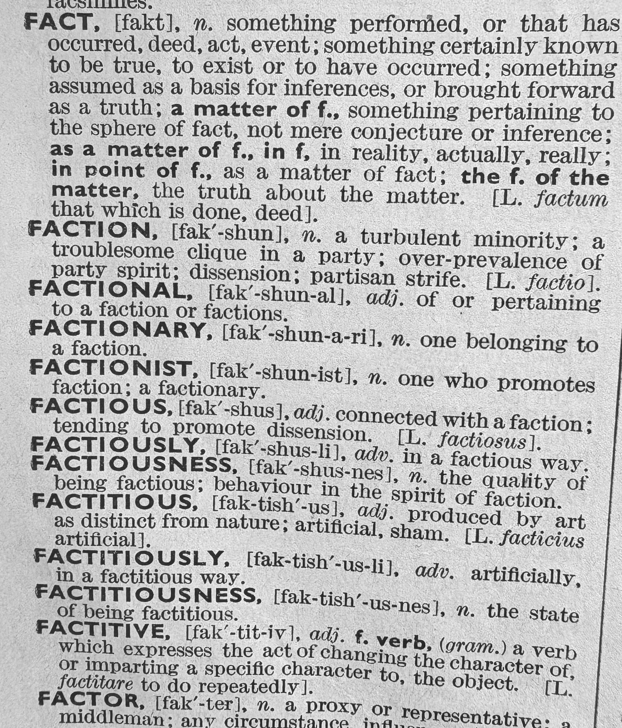 Then there’s the word ‘facture’ which means to make something (like fake factcheckers). Fascinating to ponder.