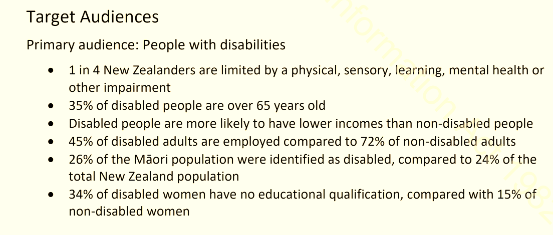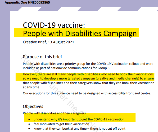 We can see in the above extract, how the NZ Ministry of Health wanted to ‘amp up’ the persuasive (coercive) ‘layer’ of the jab campaign, to include some harder-hitting (fake) messages. Hit them hard (with fear), whilst dangling the enticing carrot of ‘freedom’ if you get jabbed. The ethical implications of exploitation in this campaign seemingly didn’t even need a mention? Yet this Brief sets out the extent of this ‘Target’ population who suffer a disability: