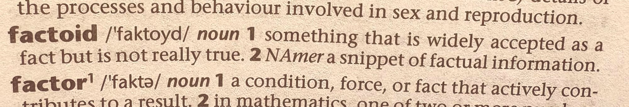 For those lovers of language amongst you (and I know there are a few), there is an interesting flow of etymology and ideas throughout this word ‘factoid’. For instance, the word ‘fact’ comes from the Latin ‘factum’ meaning a done deed.