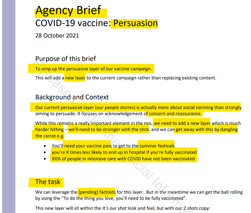 A shout out to diligent Erika at Number 8 Workers’ Union, who has brought to our attention recently a problematic word in this important Official Information Act (OIA) response from NZ Government/Ministry of Health. This response provided context to the Ardern-era Covid Campaign to coerce citizens to get the jab, called “It’s our shot":