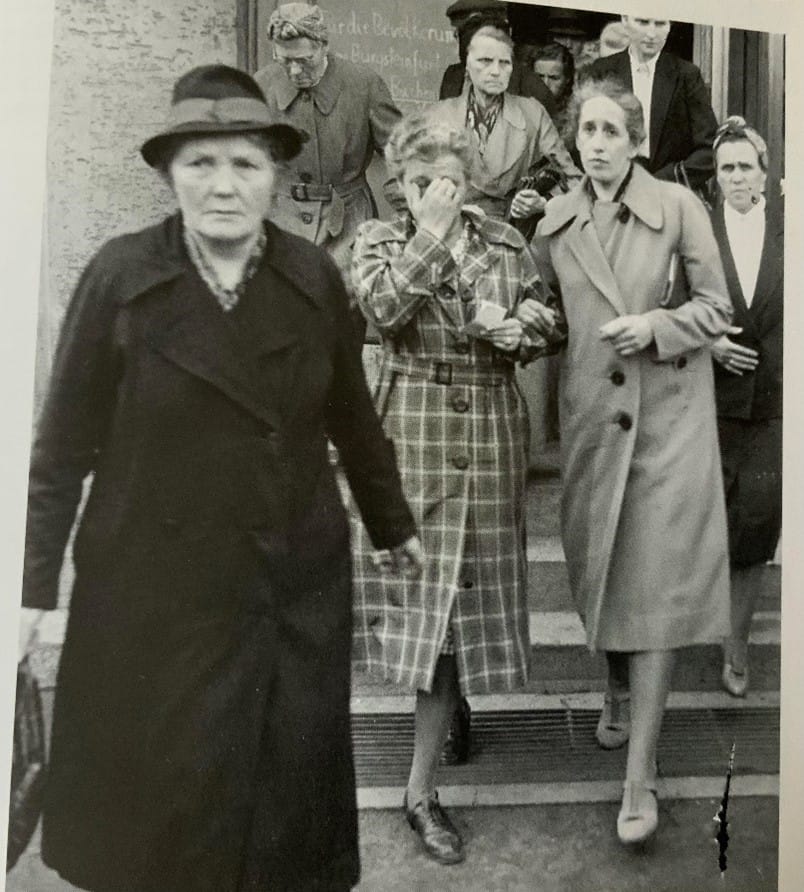 Above is an image (taken from this book) of some residents as they left the cinema. Study their faces: the hideous reality of the crimes to which they had been complicit, finally dawned on them. The fear that had kept them compliant finally exposed by the truth.