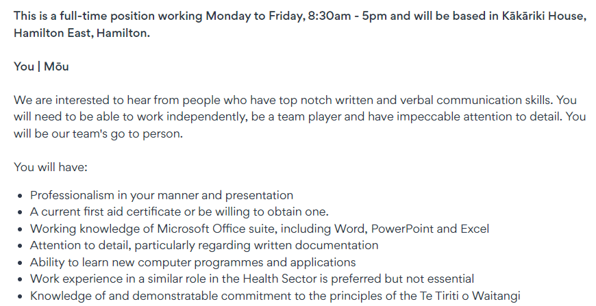 This entity is a ‘charitable trust’ and subsidiary of Te Rūnanganui o Ngāti Porou. They claim to be “an integrated Hauora, Housing and Whānau Oranga (support services) provider…” and this role involves working with offenders and their families. It is full-time, and looks extremely demanding. This is from the job description: