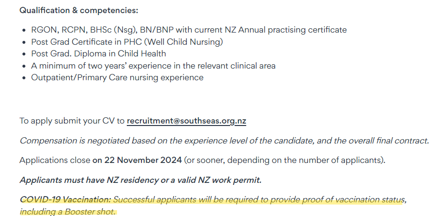 This is a nursing role focused on Islander [Pasifika] families: “Purpose: To contribute to the overall management of Child Development by providing expert nursing care, as necessary. To provide expert nursing care ensuring excellent health and improved child growth and development.” The role demands high level quals and experience, oh and at least THREE doses: