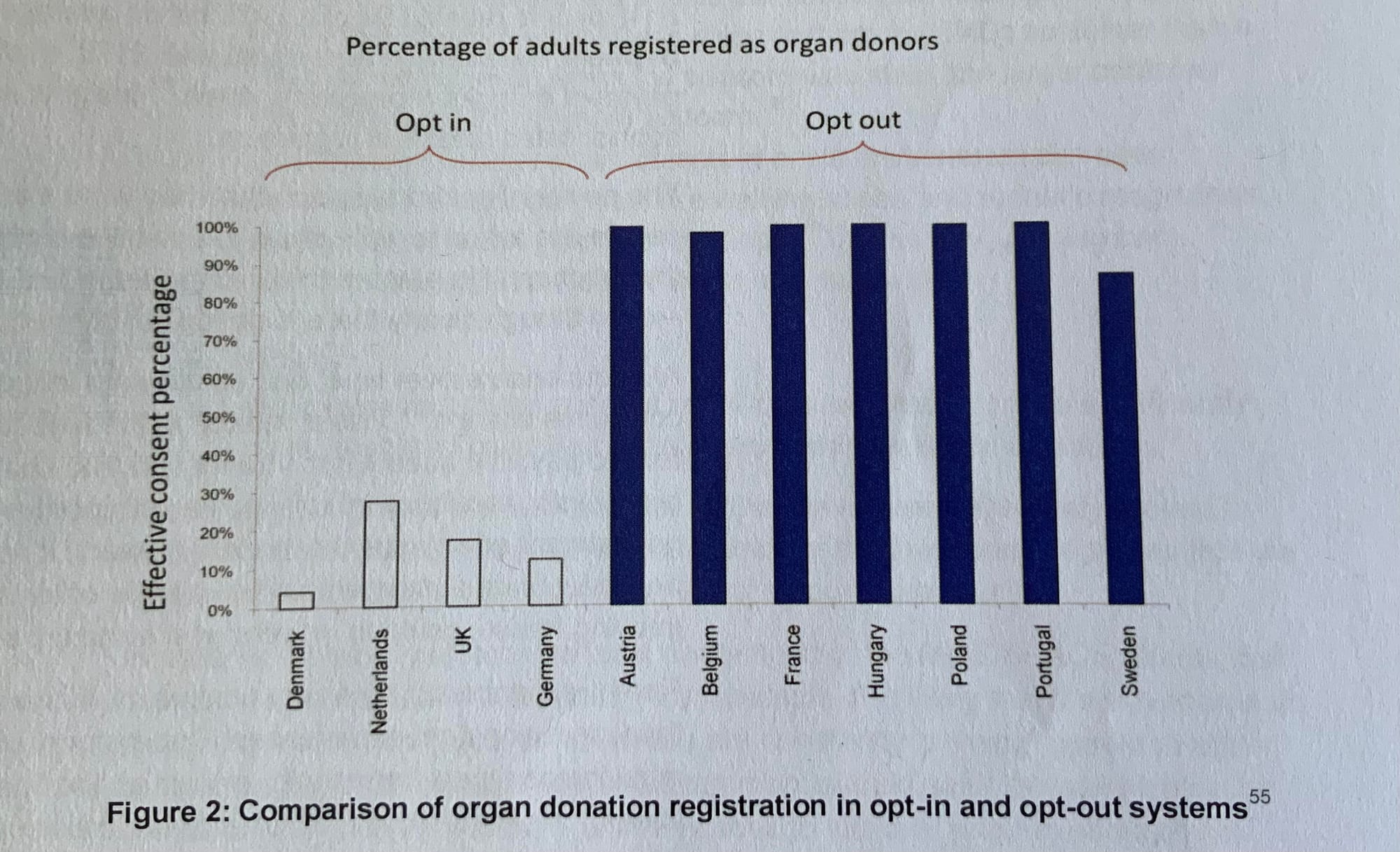 Here’s an example below of some sludge from that infamous 2011 UK ‘Nudge Unit’ report, ‘Mindspace’, where it describes the difference between the ‘opt in’ and ‘opt out’ versions on the organ donation forms in different countries:
