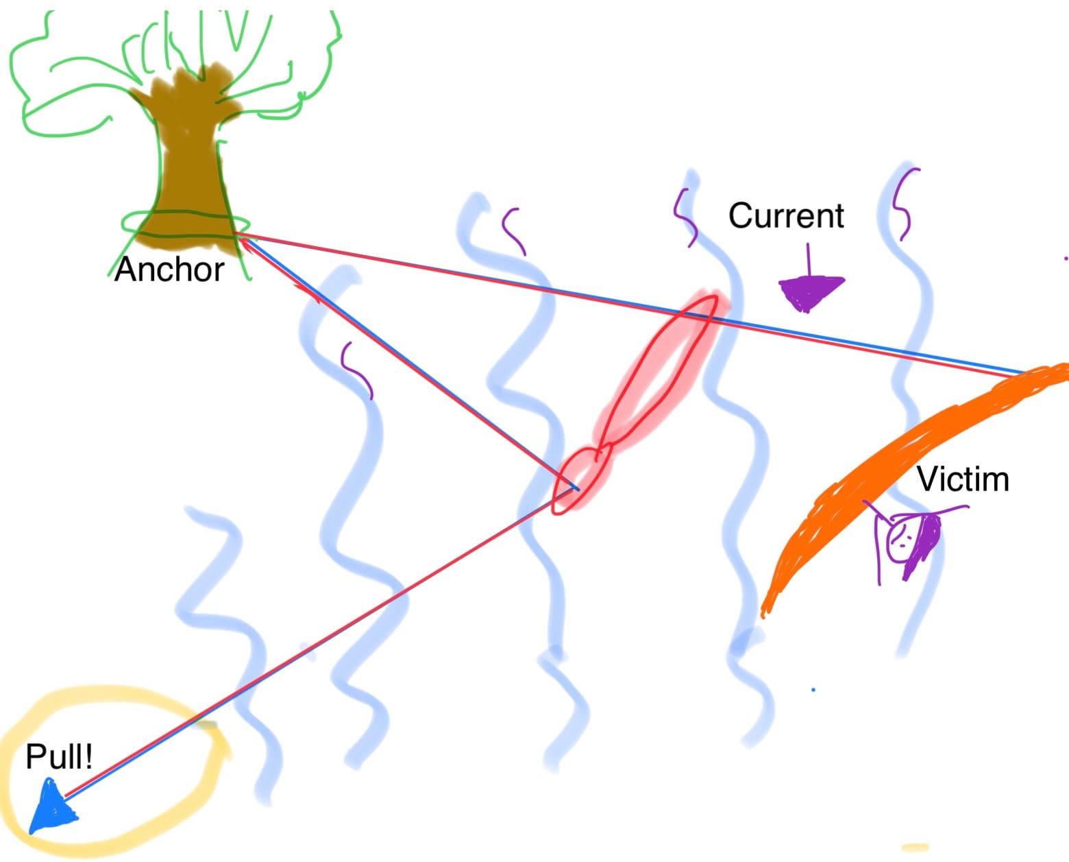 The importance of this strategy is that the extra power it provides the person(s) pulling the other end of the rope. It can be a lot simpler than the image portrayed above. I couldn’t find an non-copyright image of the simple Z-drag, so here’s one I drew on my iPad (don’t laugh):
